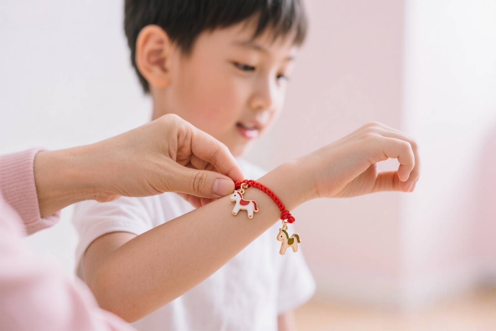 提前准备一根红绳,编成手链,今年是马年,所以我还准备了一个小马挂件,串在一起简单又有意义,呼应马年“一马当先”的期许。