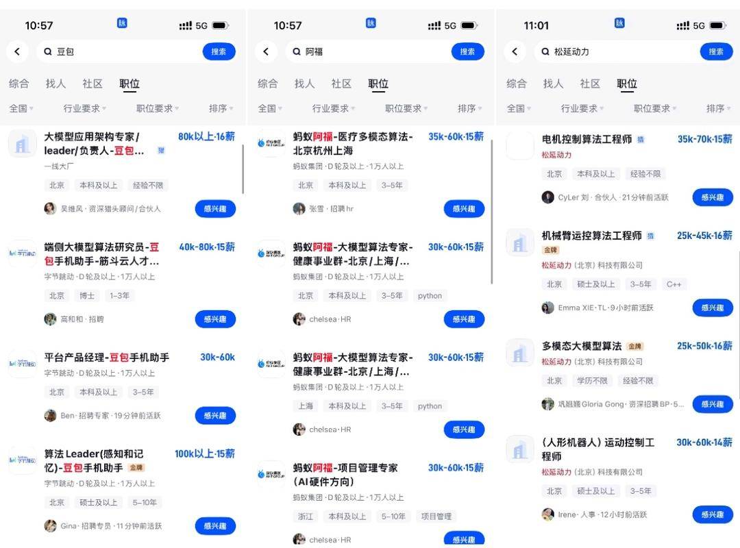 登上央视春晚的多家企业都在脉脉招聘人才,岗位类型覆盖研发、产品、运营等方向,多个岗位年薪超100万元。宇树科技持续在脉脉社区发布帖子招聘人才。今年春节期间,宇树科技HR发帖称“宇树一直在招聘研发,现在投递私聊,年后优先处理”。字节跳动的豆包业务给“大模型应用架构专家”开出了128万元的年薪,“平台产品经理”月薪最高也达到6万元。