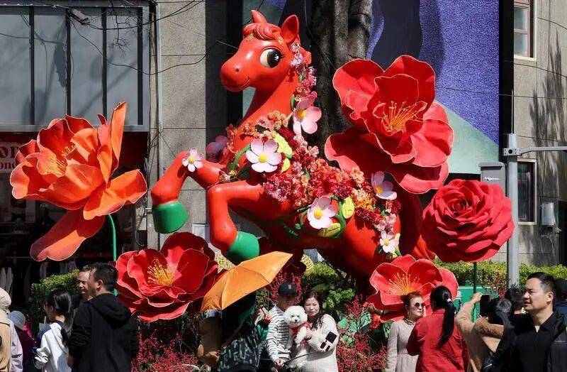 游人在南屏街喜庆吉祥马装饰造景前打卡拍照。