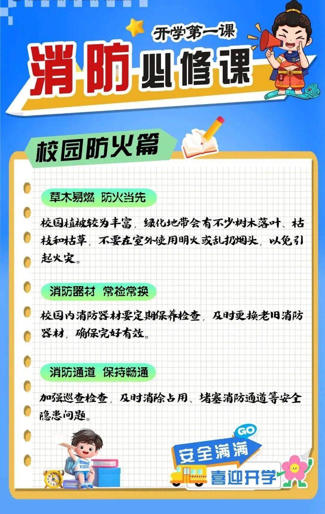 开学前组织专业人员对校园内的消防设施器材(如灭火器、消火栓、火灾报警系统等)进行全面检查和维护,确保其完好有效,能正常使用。