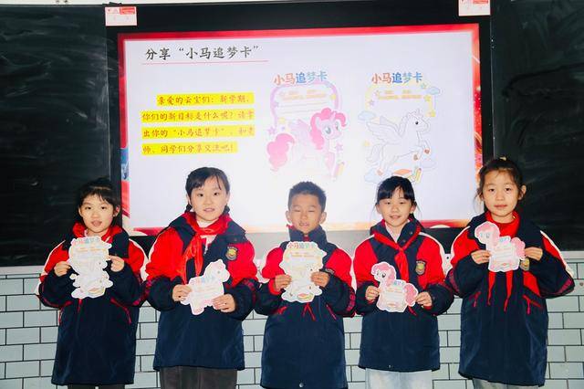 返校当天,全校各班准时开展开学第一课主题班会。班会围绕观春晚·汲取奋进力量、收身心·整装待发启新篇、定目标·一跃复新程、守常规·严于律己助成长、再扬鞭·梦想为翼创辉煌五大板块展开,内容详实、层层递进。班会中,同学们围绕小马追梦卡分享新学期梦想与目标,将美好期待凝于卡片纸上,一张张色彩明快的追梦卡汇聚成班级“梦想马”展示墙,成为校园里一道温暖而亮眼的风景。