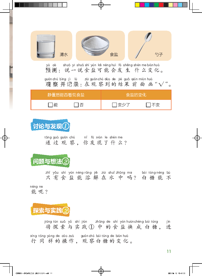 二年级是科学启蒙的进阶阶段,2026秋粤教科技版二年级科学上册新教材,紧扣2022版义务教育科学课程标准,延续“玩中学、做中学”的核心理念,编排4大单元、14节课,侧重引导孩子主动观察、动手实验,知识点贴合生活、通俗易懂,无复杂理论,适配二年级孩子的认知特点,电子版教材高清可打印,方便孩子预习、家长辅导、老师备课,助力孩子从“感知科学”向“探究科学”稳步过渡。全单元核心知识点精准拆解,贴合进阶启蒙需求,兼顾实验与知识传递:第一单元《空气和水》,核心是引导孩子认识空气和水的基本特征——空气无色、无味、透明,看不见摸不着却真实存在,能占据空间、具有流动性,可通过扇风、吹气球等现象感知;水同样无色、无味、透明,具有流动性,能随容器改变形状,还会呈现固态(冰)、液态(水)、气态(水蒸气)三种状态并相互转化。同时还会学习溶解现象,知道盐、糖能溶解在水中,油不能溶解在水中,搅拌和提高水温能加速溶解,了解空气和水对人和动植物的重要作用,培养爱护资源的意识。第二单元《感觉器官》,重点认识眼睛、耳朵、鼻子、舌头、皮肤五种感觉器官的位置和功能,学会运用单一感觉器官观察事物,更能掌握多种感觉器官协同运用的方法,比如认识水果时,结合看、摸、闻、尝全面了解其特点,同时明确每种感觉器官的保护方法,比如保护眼睛要保持正确读写姿势,保护耳朵要远离噪音、不用尖锐物挖耳等,养成爱护身体的好习惯。第三单元《不同的季节》,围绕四季更替展开,引导孩子认识春、夏、秋、冬的典型特征,知道春季万物复苏、夏季炎热多雨、秋季硕果累累、冬季寒冷干燥,了解季节变化对植物、动物和人类生活的影响,简单了解四季形成与地球公转有关,学会观察季节变化的现象,养成关注自然的习惯。第四单元《橡皮筋动力小车》,是工程实践单元,结合前三单元知识点,引导孩子动手制作橡皮筋动力小车,观察小车的运动现象,尝试调整小车形状、橡皮筋松紧度来优化运动效果,同时了解生活中的其他科技产品,培养动手能力和探究精神,感受科学与生活的密切联系。整套教材每个单元都搭配趣味小实验、小游戏,兼顾知识传递与能力培养,适配二年级科学进阶启蒙的核心需求。