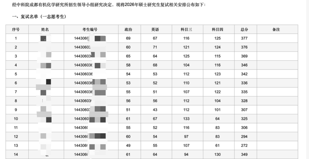 中国科学院成都有机化学研究所发布了2026年招收攻读硕士学位研究生复试一志愿考生名单。