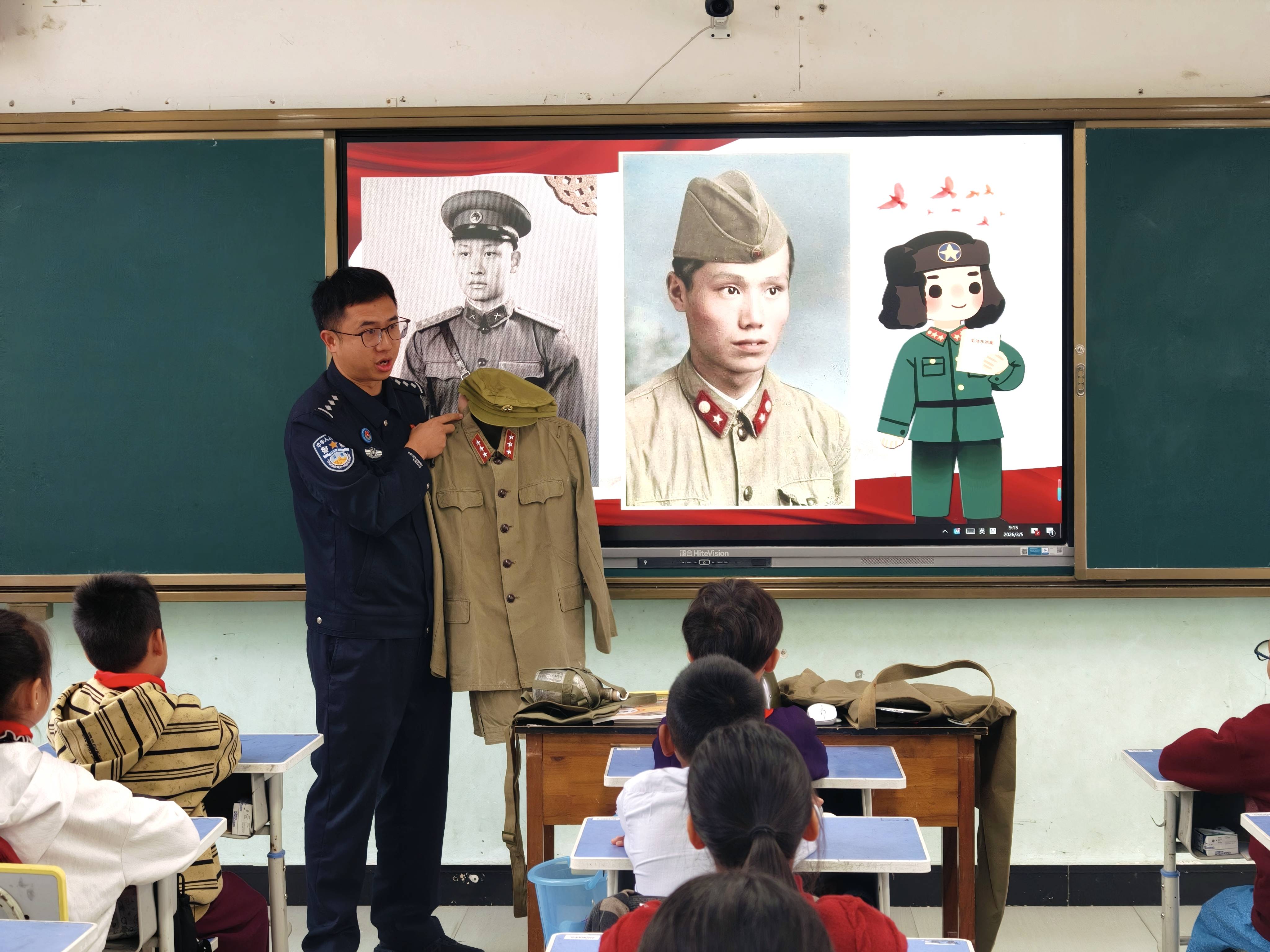 课堂从一套雷锋入伍时期配发的“五八式”军装开始。民警手指抚过领口的红领章,向孩子们讲述“一件军装,一生使命”的雷锋故事。当黑白老照片、彩色影像与卡通版雷锋形象同屏呈现,一场跨越时空的对话悄然展开,雷锋形象从书本走入现实,忠诚与奉献的精神内核吸引着孩子们清澈而专注的目光。