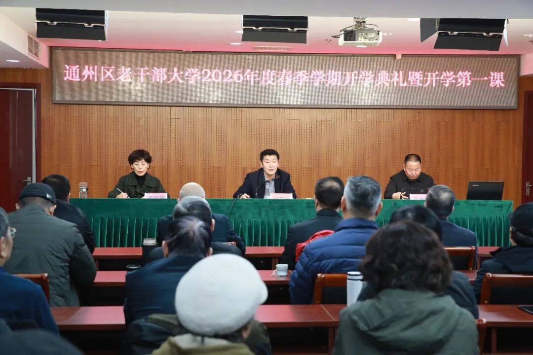 3月18日上午,通州区老干部大学举行2026年春季学期开学典礼暨开学第一课。通州区委组织部副部长、老干部局局长、老干部大学校长安文崑出席活动并讲话,通州区老干部大思政研究会副会长惠学刚为老同志们讲授“开学第一课”。通州区老干部大学校委会全体成员、教师骨干和学员代表共计100余人参加。开学典礼由通州区委老干部局副局长张春明主持。
