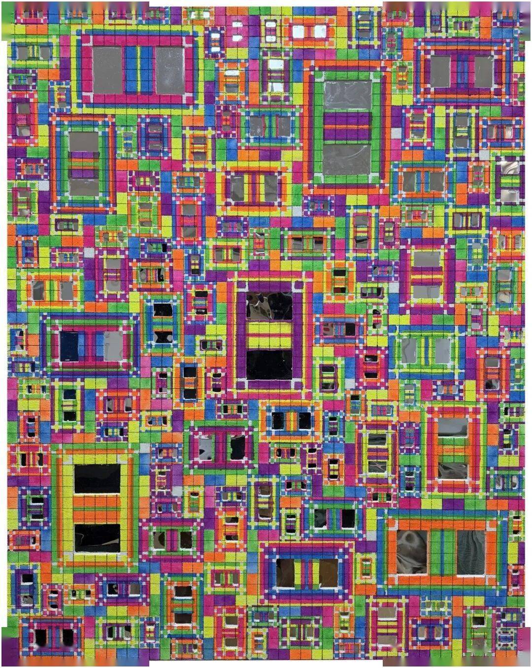 “秩序”既是一种结构,也是一种理解世界的方式。我的这一系列作品以“秩序”为主题,通过重复、嵌套与网格化的结构构建出一种既稳定又不断生长的视觉系统。画面中的基本形态来源于中国汉字结构中的“曰”“日”“目”“田”等字形,它们在东方文字中既是语言的单位,也是观看与记录世界的符号。我将这些字形拆解为几何框架,并通过综合材料的方式进行重组,使其在画面中形成类似浮雕的肌理与层次。镜面、树脂、纸浆、丙烯以及不同材料的叠加,使表面既具有绘画性,也具有物质的厚度与时间痕迹。秩序在这里既是视觉结构,也是对信息、城市与当代生活节奏的一种隐喻:无数细小单元在不断重复与扩散中生成整体,而规则之中又隐藏着流动与变化。