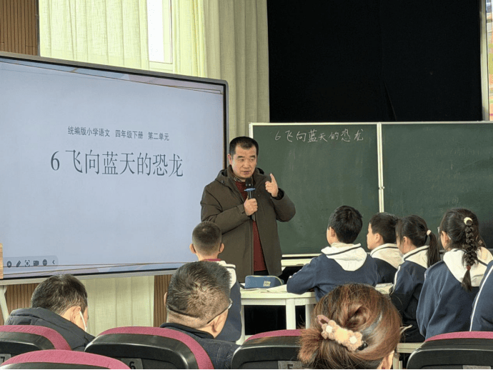 教学过程中,朱老师还补充相关背景资料,引导学生初读课文时边读边提出疑问,最终梳理出课文核心围绕“恐龙衍变”展开。默读环节,朱老师带领学生从第二段中提炼科学家关于“恐龙变成鸟类”的假说,重点关注文本中“有些……有些……”的句式,通过反复朗读让学生体会列举的表达效果,并从行走方式、体型大小、食性特点等角度,分析恐龙种类的多样性,进而探究恐龙演化成鸟的关键条件,如“骨骼中空、脑颅膨大、前肢变长、长出羽毛”等,最后结合板书梳理“假说—证据—推测—结果”的逻辑链条。整堂课教学方法多样,注重阅读方法传授,通过词语带读、关键信息提取、提出假说探究等方式,为学生搭建了扎实的语文学习支架,助力学生提升文本解读能力。