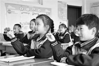 在山东省淄博市高青县唐坊学区和店小学,学生正跟随教师展示规范执笔姿势。 孙传波 摄