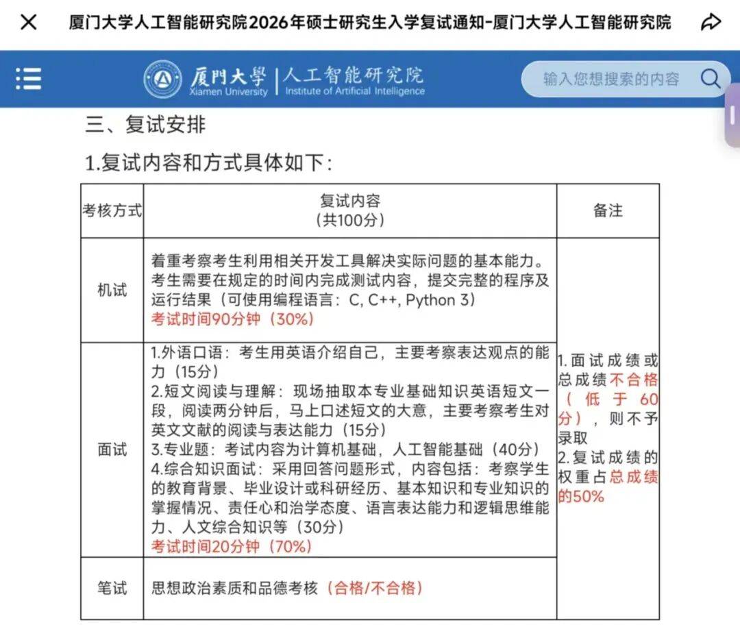 厦门大学人工智能专硕的复试分为两种形式,总计为100分,即机试(占复试成绩30%)+面试(占复试成绩70%)。