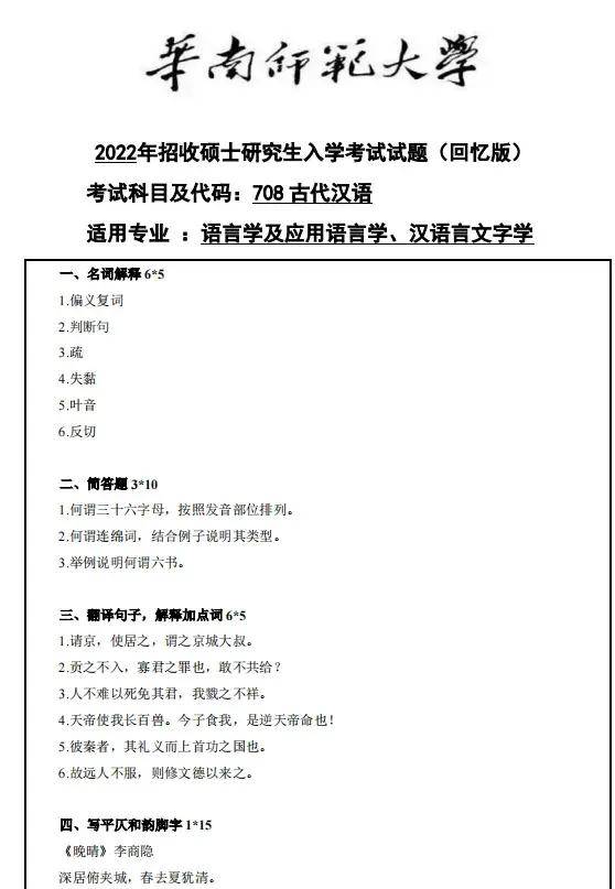 华师语言学科目,往年为708汉语基础【古代汉语+现代汉语】独立科目一张卷