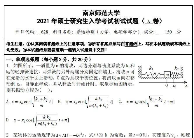 2006-2022年南京师范大学630普通物理考研真题参考答案【19年开始答案手写版,答案到22】