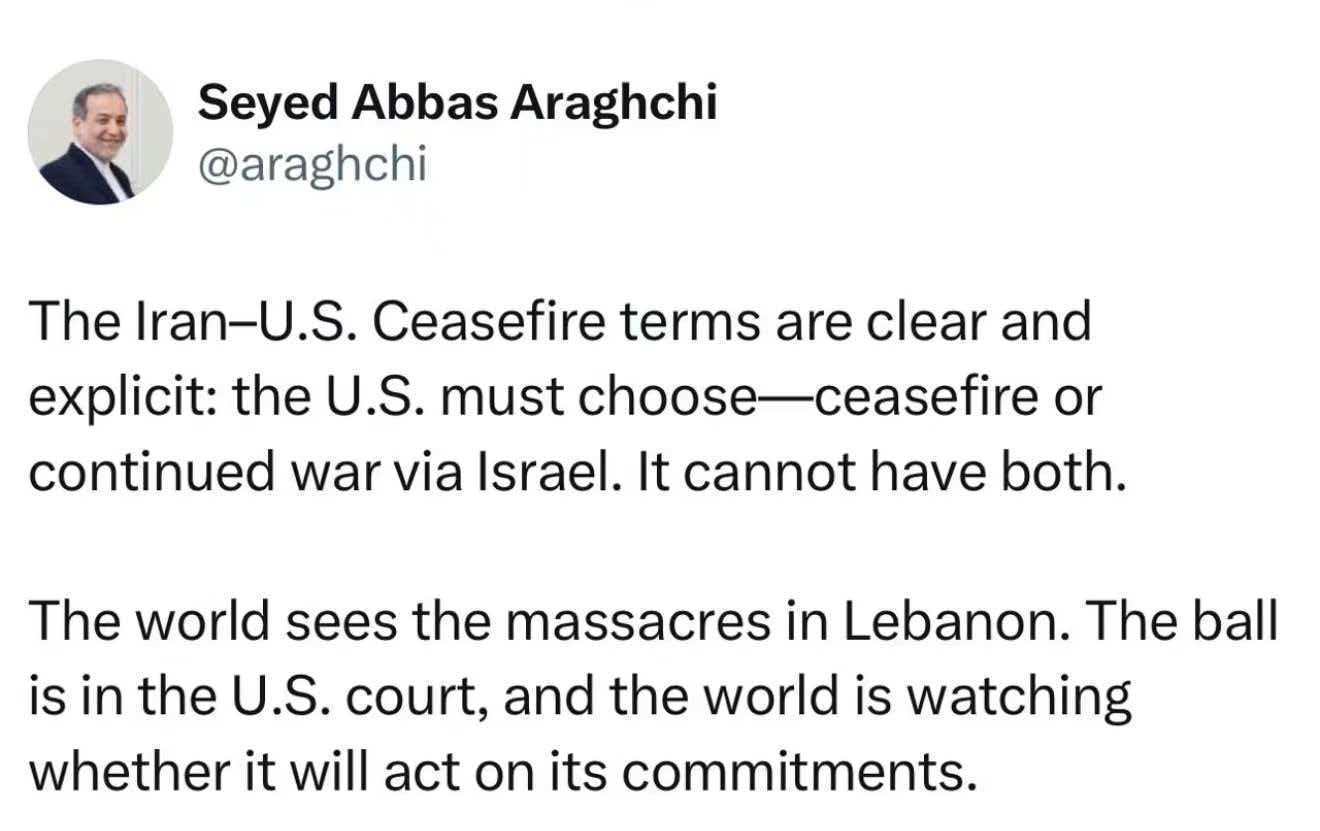 4月9日,伊朗外长阿拉格齐也在社交媒体发文称,伊朗与美国停火协议的条款清晰、明确,美国必须作出选择:要么停火,要么通过以色列继续开战,不能指望兼得。全世界都目睹了发生在黎巴嫩的大屠杀。全世界都在关注美国能否履行承诺。
