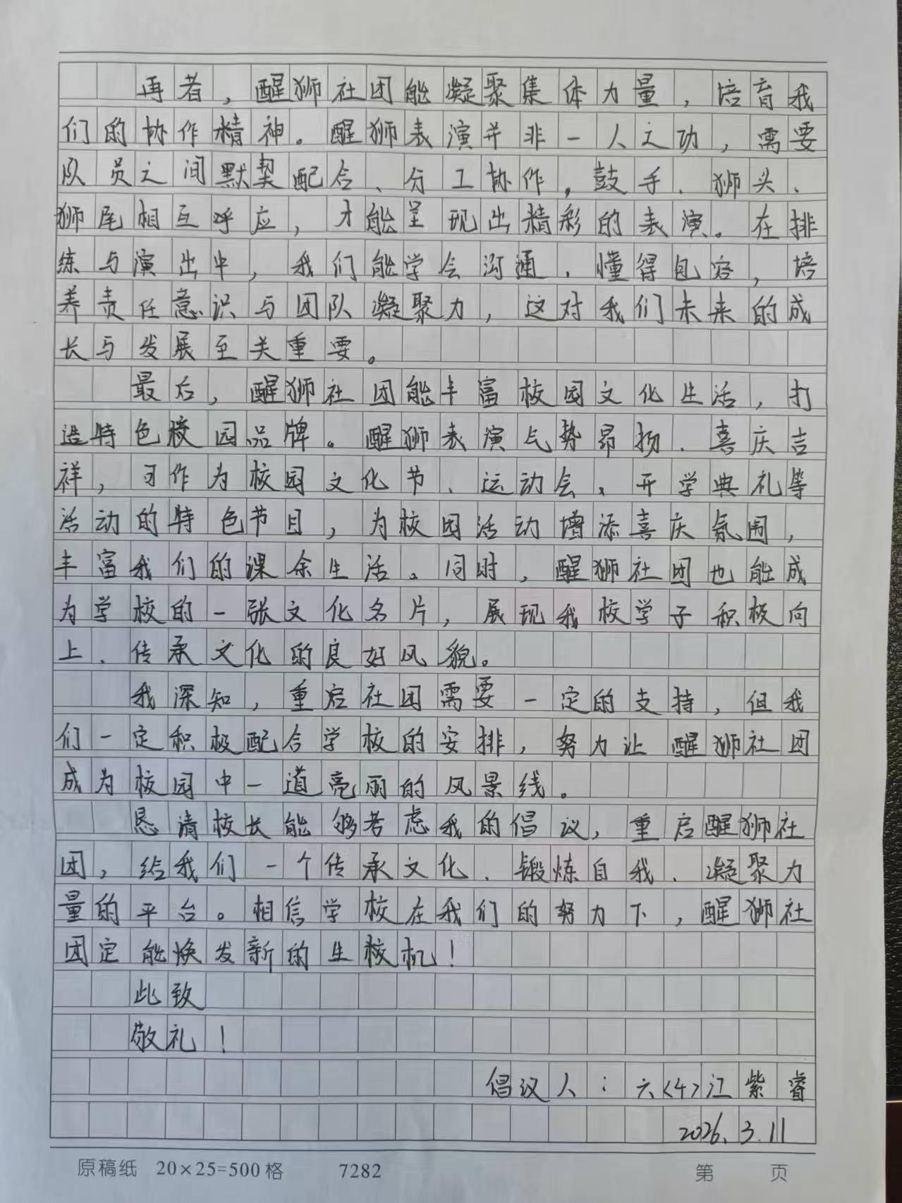 在信中,她条理清晰地阐述了重启醒狮社团的多重价值:“重启醒狮社团,首要益处便是助力我们锻炼身体、愉悦身心。当下,我们多忙于学业,缺乏充足的户外运动,久坐学习易导致体质下降、精神疲惫。醒狮运动融合了跳跃、旋转、击打等动作,既能锻炼肢体协调性、力量与耐力,又能在欢快的鼓点与灵动的舞姿中,释放学习压力、舒缓情绪;其次,重启醒狮社团,是传承非遗、厚植家国情怀的重要途径。醒狮是国家级非物质文化遗产,承载着中华民族的勇气、团结与奋进精神,是刻在我们骨子里的文化印记;再者,醒狮社团能凝聚集体力量,培育我们的协作精神。醒狮表演并非一人之功,需要队员之间默契配合、分工协作,鼓手、狮头、狮尾相互呼应,才能呈现出精彩的表演;最后,醒狮社团能丰富校园文化生活,打造特色校园品牌。醒狮表演气势昂扬、喜庆吉祥,可作为校园文化节、运动会、开学典礼等活动的特色节目,为校园活动增添喜庆氛围。”