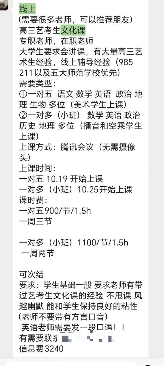 杨阳是河北一所私立学校的老师。2024年9月,她在一个线上家教群里看到了一则教育机构招募网课老师的信息,给出的课时费“有诱惑力”:针对艺考生补习文化课程,一对三600元/课时,一对五900元/课时,但老师在上课前要预付1000至3000元不等的信息费。