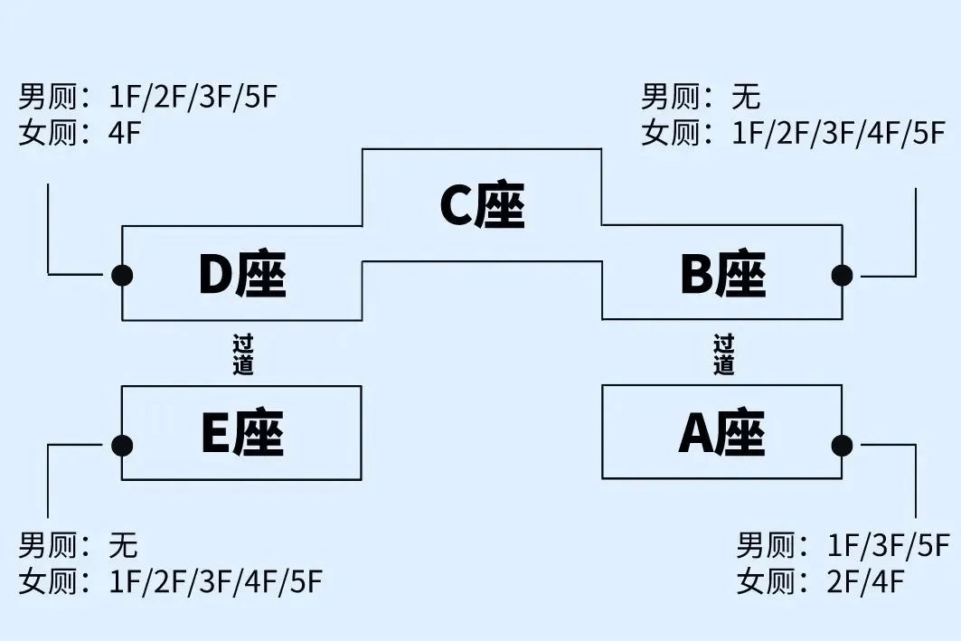 男卫生间:A106旁、D104旁、D204旁、A306旁、D304旁、A506旁、D504旁;