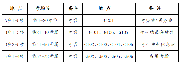 午休:非考试期间,所有考场封闭不对外开放。各位考生饭后可到G栋1楼的102/103/104/105教室进行自习或休息,现场需服从工作人员管理。
