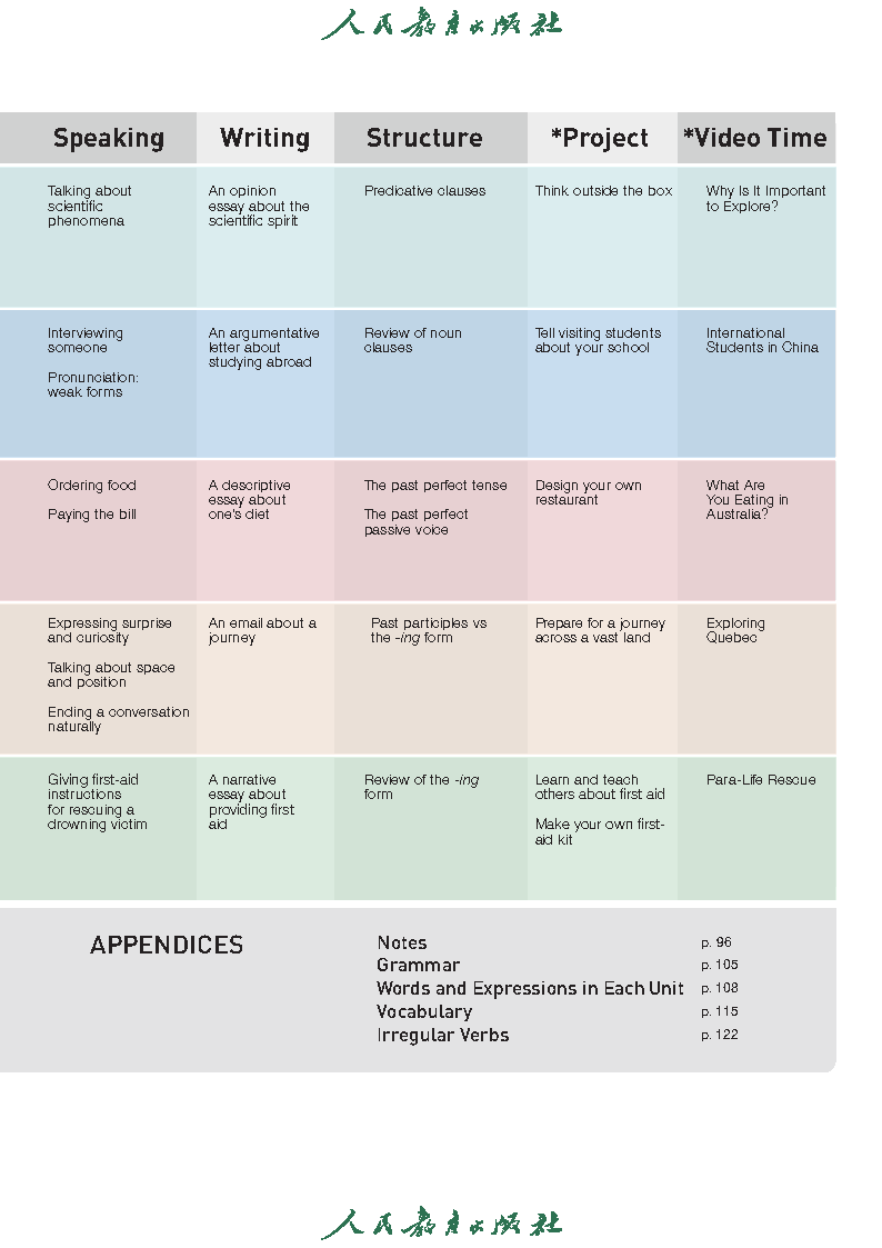- **Discovering Useful Structures**:系统讲解重点语法结构,如Unit 2中的情态动词表可能性与能力、定语从句、状语从句等,通过例句分析和专项练习,让学生掌握其用法。