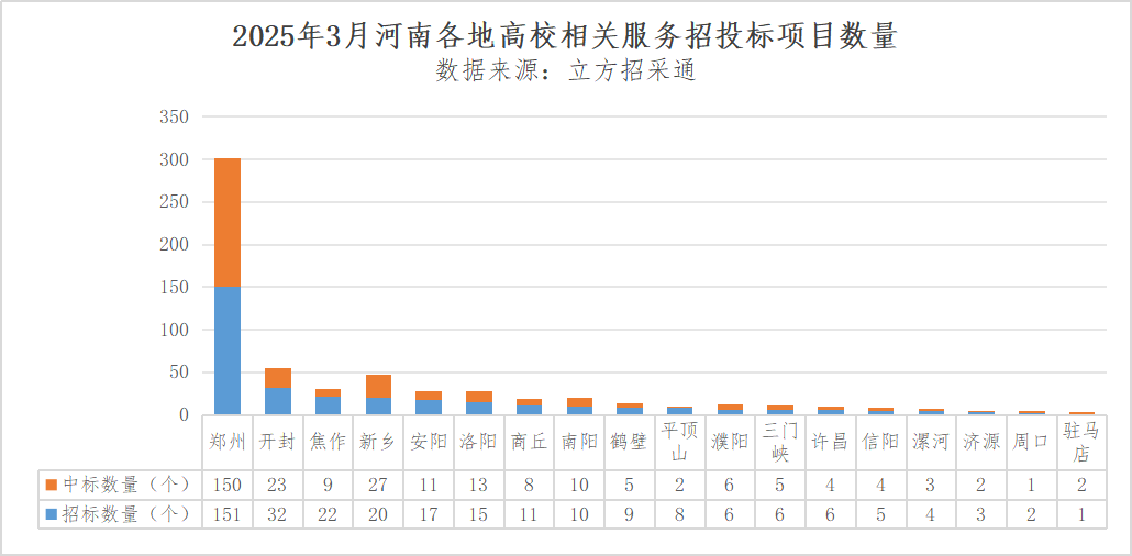 【大河财立方 见习记者 李雯雯】立方招采通统计数据显示,2025年3月份,河南省高校相关服务的招标和中标项目数量总计612个。其中,招标项目有327个,中标项目为285个,多个项目金额达千万元以上,省内高校招投标市场持续活跃。