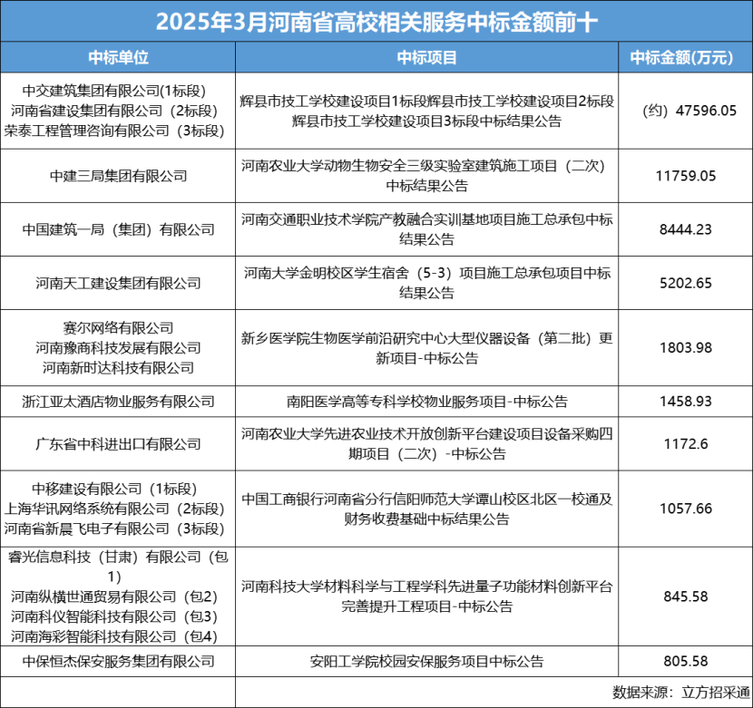 中建三局集团有限公司1.18亿元中标河南农业大学动物生物安全三级实验室建筑施工项目(二次)、中国建筑一局(集团)有限公司8444.23万元中标河南交通职业技术学院产教融合实训基地项目施工总承包项目,分别位居中标金额第二、第三位。