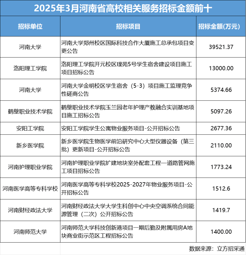 根据立方招采通数据,2025年3月,河南省高校相关服务招标项目327个,招标金额达千万元以上的项目16个。河南大学郑州校区国际科技合作大厦施工总承包项目以3.95亿元的最高投标限价领跑,位居采购金额首位。