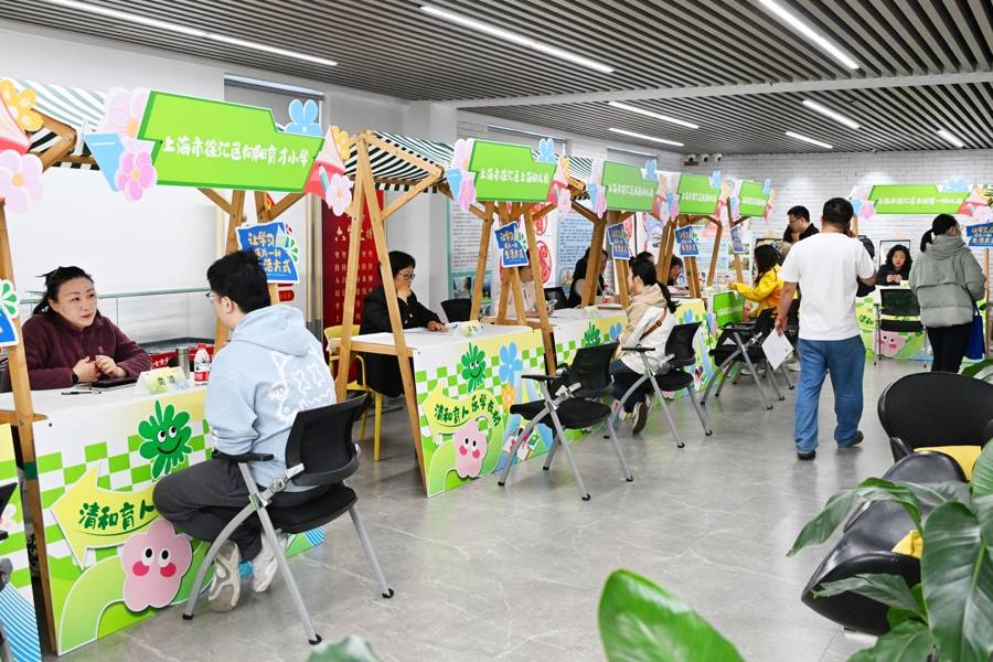 上午九点,长桥街道党群服务中心的大厅中一派热闹的景象,各教育单位教师代表齐聚一堂,为各年龄段的学生及其家长提供入学入园政策解读、学习方法指导、学校办学特色展示等多维度咨询服务。