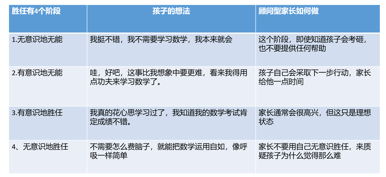 我想所有的家长都想孩子至少达到第3个阶段吧,能有意识地胜任某一件事情,比如学习数学,但是如果孩子不靠自己顺利通过其他阶段,家长想太多也没用。