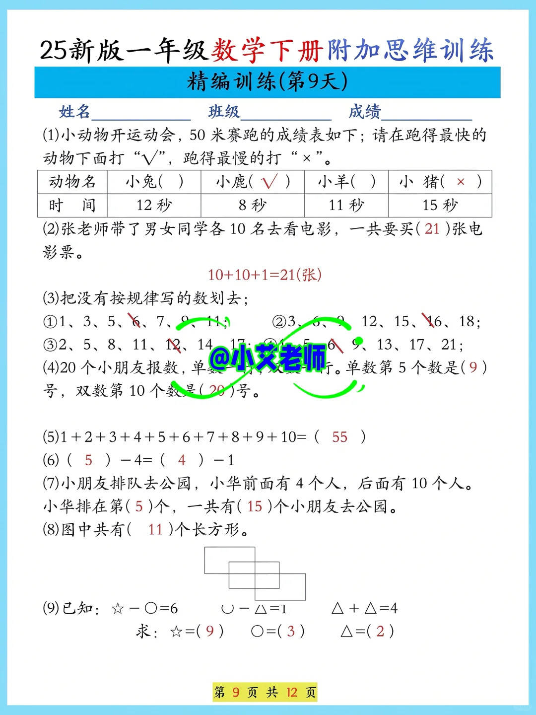 今天给大家分享一套超实用的 25 新版一年级数学下册附加思维训练精编训练资料,包含了不同日期的练习题,像 day3、day5、day9、day11 等等。题目类型特别丰富,有排队问题、找规律填数、图形计数,还有简单的运算和逻辑推理题。比如说排队问题,能让孩子学会思考自己在队伍里的位置;找规律填数又锻炼了他们对数字变化的敏感度。
