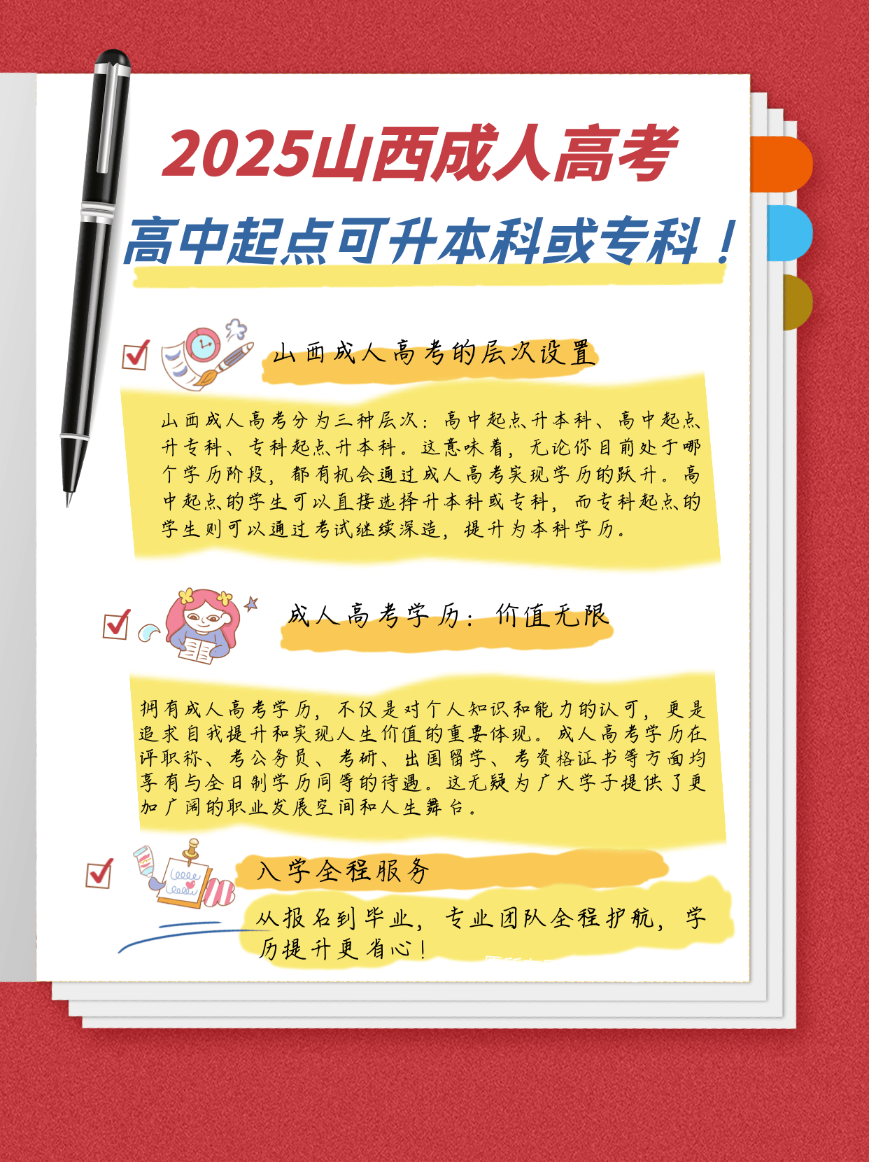 层次多样,选择灵活:2025年山西成人高考延续了以往的多样化学历层次设置,包括高中起点升本科、高中起点升专科以及专科起点升本科三种报考层次。这一政策调整,使得不同学历背景的考生都能找到适合自己的提升路径,满足不同人群的学历需求。