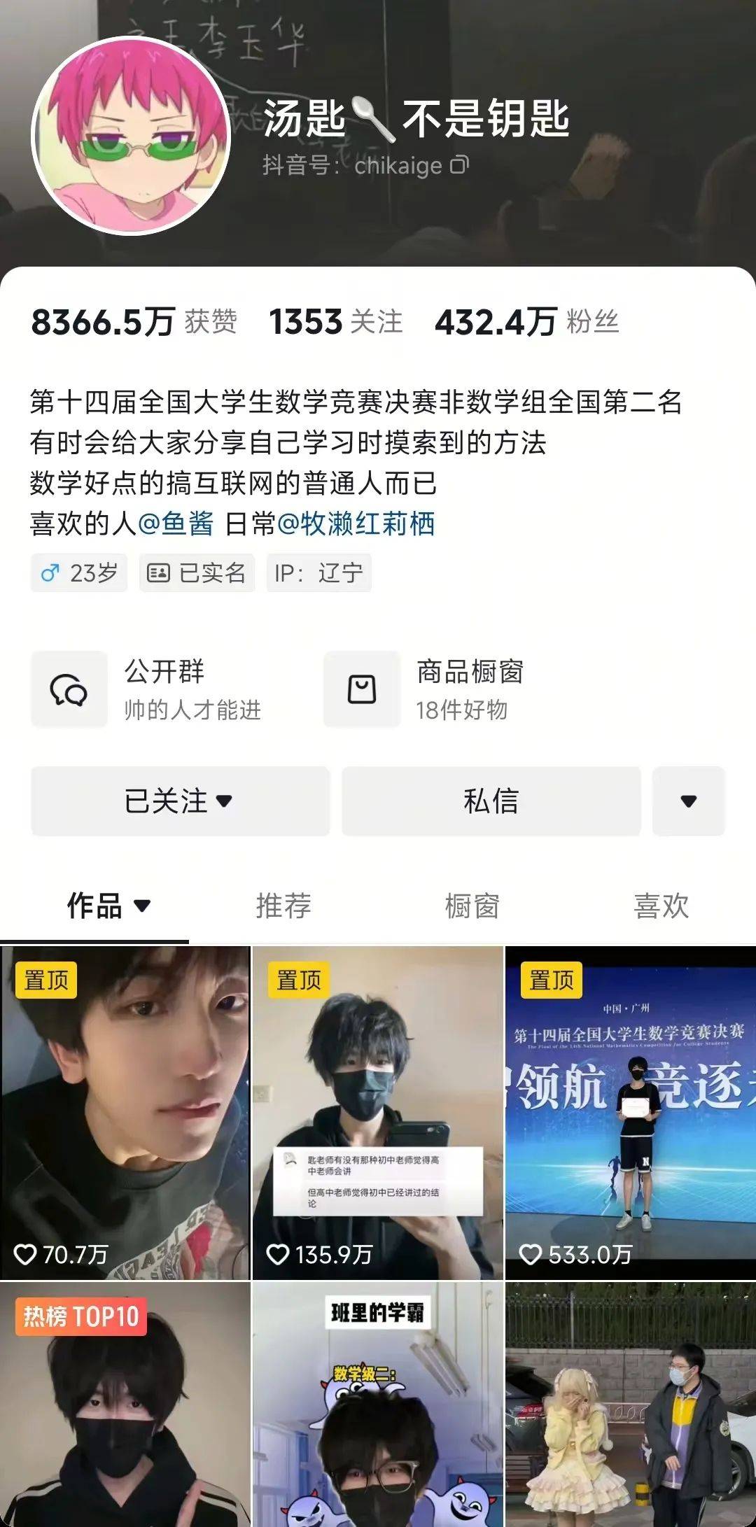 “我没有停更,在备考期间,我一直在保持更新。”“汤匙 不是钥匙”曾在2月底接受采访时称,他的本名叫匙凯歌,今年23岁,报考的是北京大学数学科学学院金融专业,今年是第二次考研,已经上线(初试)。去年报考的同样是北京大学数学科学学院金融专业,成绩是399分,差一分进入复试。