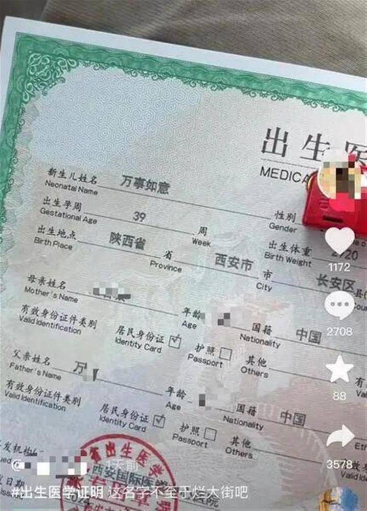 如今,为了给孩子起一个与众不同的名字,很多父母绞尽了脑汁。2022年10月,安徽的一位女子在其个人账号上传了一条视频,视频中的出生医学证明上显示新生儿姓名为“伍拾忆”。2024年4月,一名网友展示出一张出生医学证明,其中孩子姓名为“万事如意”,并配文“这名字不算烂大街吧”。这些独特的姓名都曾引发网友热议。