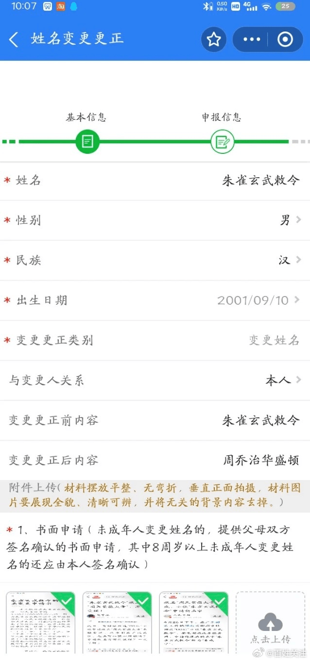 据媒体报道,00后湖南小伙原名叫“朱云飞”,2024年5月改名为“朱雀玄武”,2025年1月再次改名为“朱雀玄武敕令”。2025年4月,小伙称自己现用名为“朱雀玄武敕令”,因该名易引发误解且拗口,申请随母姓并更名为“周天紫微大帝”,引发热议。后因“不得违背公序良俗,不得使用具有一定社会知名度、造成公众混淆的姓名”为由未能通过。