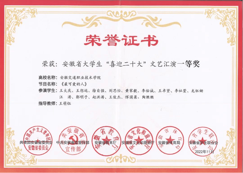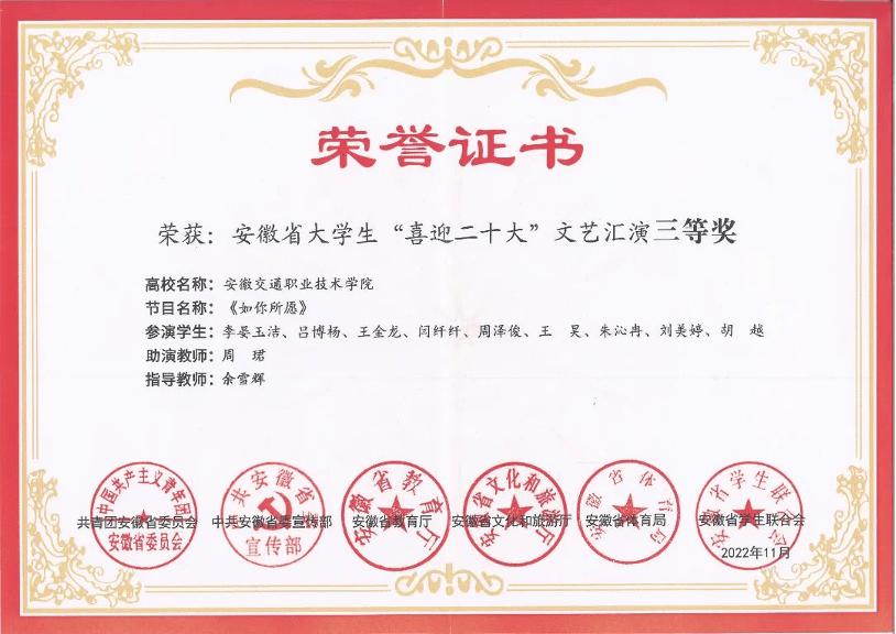 歌伴情景《如你所愿》荣获安徽省大学生”喜迎二十大”文艺汇演三等奖。