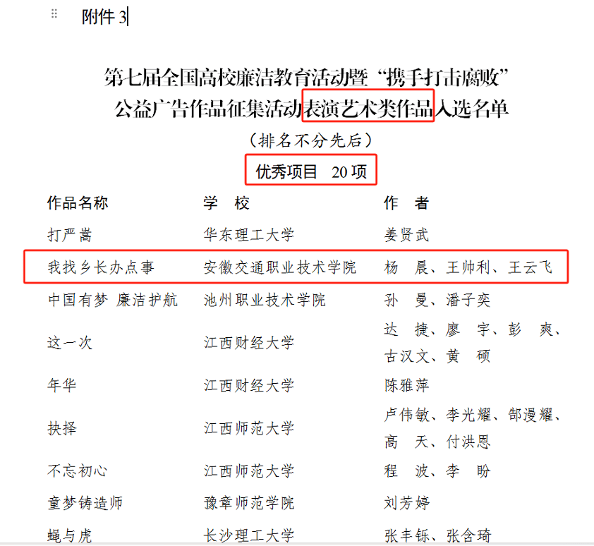 小品《我找乡长办点事儿》荣获第七届全国高校廉洁教育活动暨“携手打击腐败”公益广告作品征集活动表演艺术类作品优秀项目(全国仅20项)。