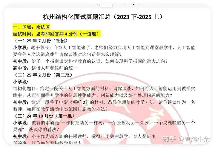 2025年杭州教师招聘结构化面试怎么考?在杭州教师招聘中,结构化面试在杭州大部分区域都会设计到,也是重要考核标准,各区对结构化面试占比分数都不同。今天带大家一起来熟悉下杭州各区提前批结构化面试占比和重要性。结构化更多还是要储备素材和积累语言组织,答题的思维和思路。