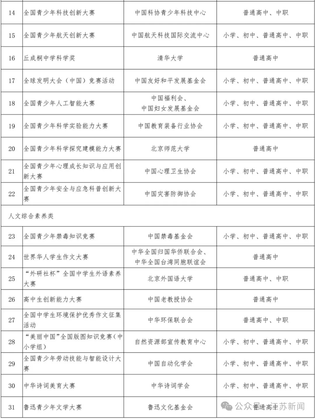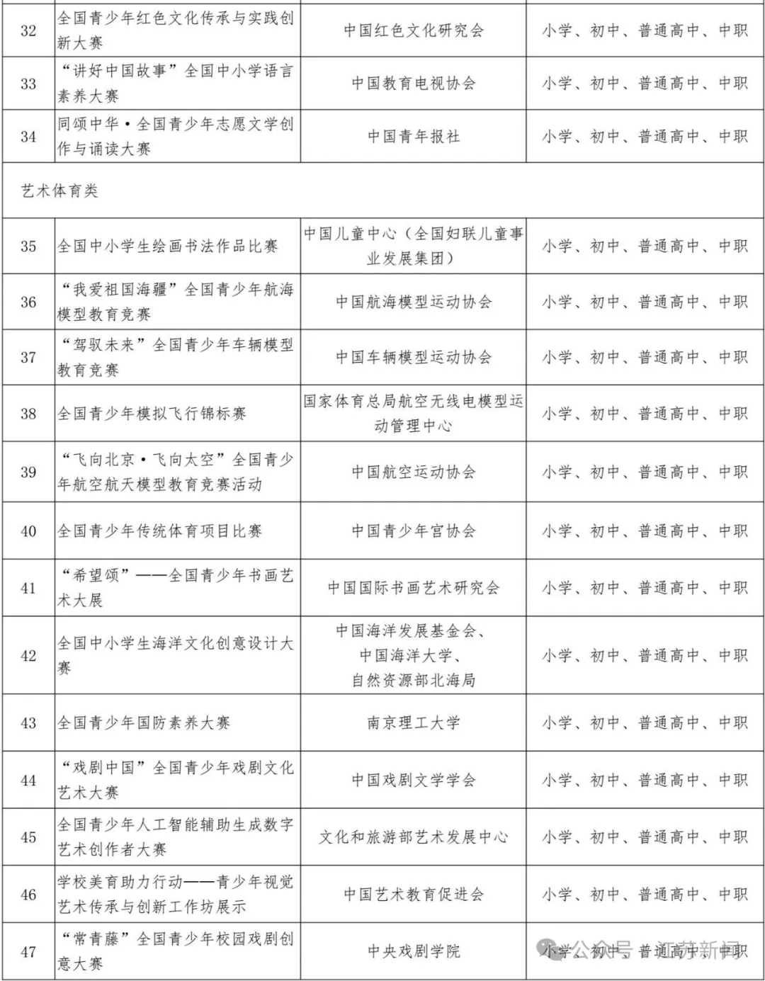 根据《教育部办公厅等四部门关于印发<面向中小学生的全国性竞赛活动管理办法>的通知》(教监管厅函〔2022〕4号)精神,由主办单位自主申报,经组织专家进行严格评审把关,拟确定全国青少年人工智能创新挑战赛等47项竞赛为2025—2028学年面向中小学生开展的全国性竞赛活动,举办时间原则上为2025年9月至2028年8月,在此期间每学年举办不得超过1次,累计不超过3次。现就相关信息予以公示,公示期为2025年9月11日至17日。