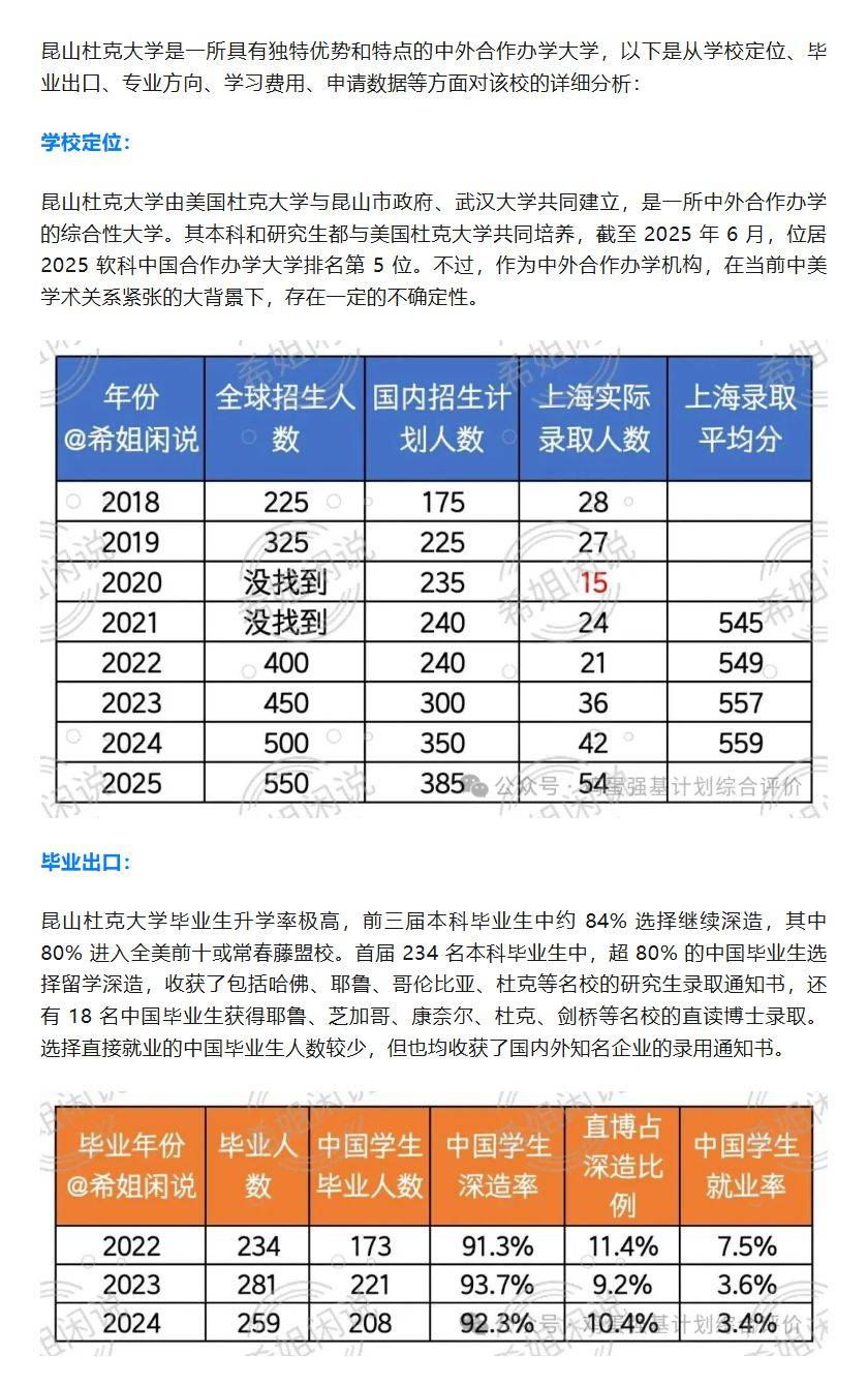 昆山杜克大学毕业生升学率极高,前三届本科毕业生中约 84% 选择继续深造,其中 80% 进入全美前十或常春藤盟校。首届 234 名本科毕业生中,超 80% 的中国毕业生选择留学深造,收获了包括哈佛、耶鲁、哥伦比亚、杜克等名校的研究生录取通知书,还有 18 名中国毕业生获得耶鲁、芝加哥、康奈尔、杜克、剑桥等名校的直读博士录取。选择直接就业的中国毕业生人数较少,但也均收获了国内外知名企业的录用通知书。