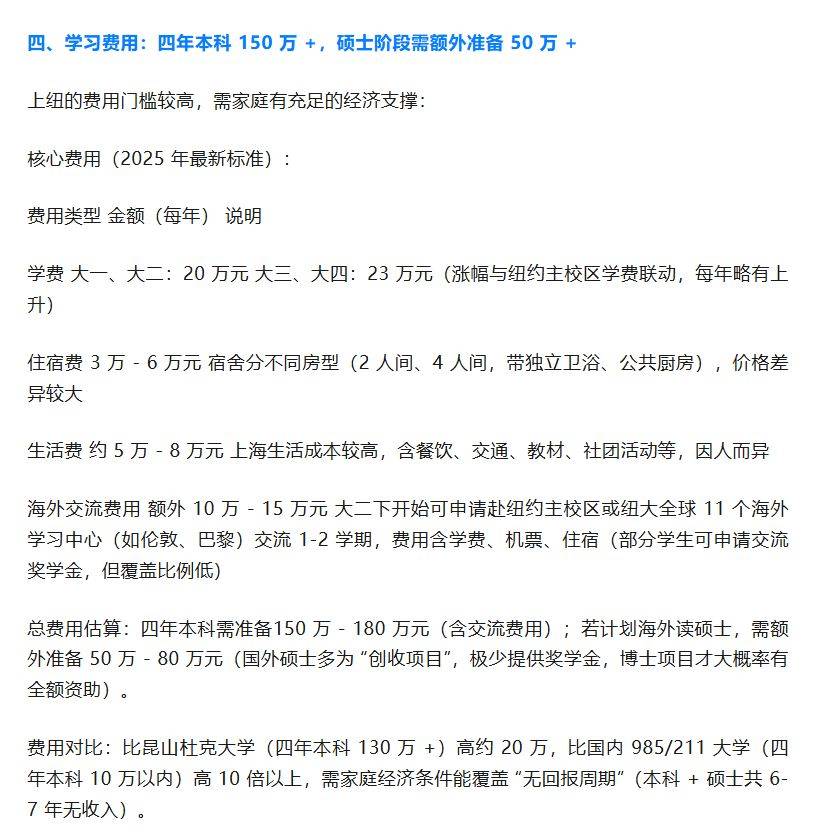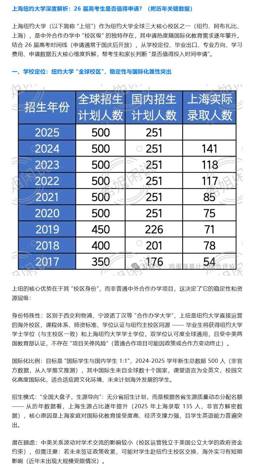 每年中国学生直接就业人数仅 20 人左右(占比不足 5%),80% 以上留在上海,就业领域集中在金融(投行、外资银行)、咨询(麦肯锡、BCG 等)、科技(互联网大厂海外业务、外企研发岗),核心优势是 “全英文能力 + 国际化视野”,但需注意:若计划在国内体制内就业(如公务员、事业单位),上纽的 “海外校区标签” 认可度略低于同分数段的 985 院校。