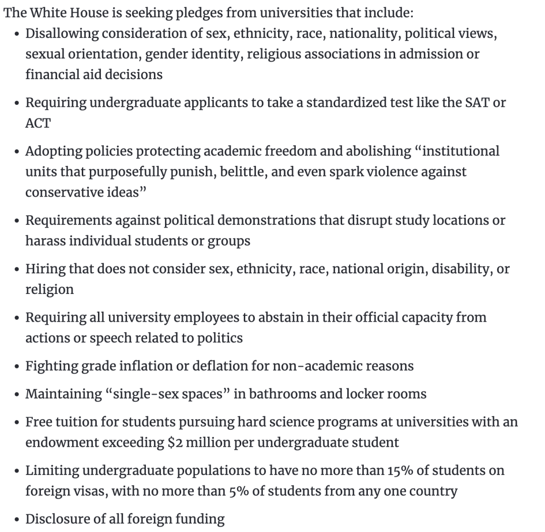 本周三(10月1日),特朗普政府向部分顶级大学发布了备忘录,提出了一项名为“学术卓越契约”的新提案。