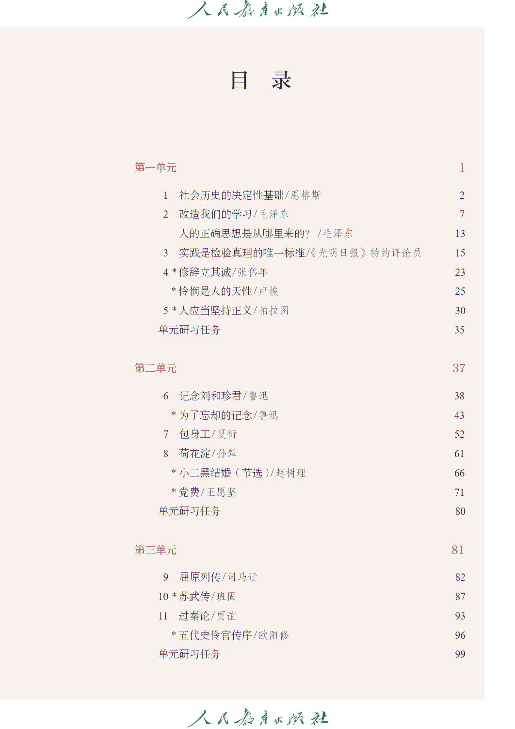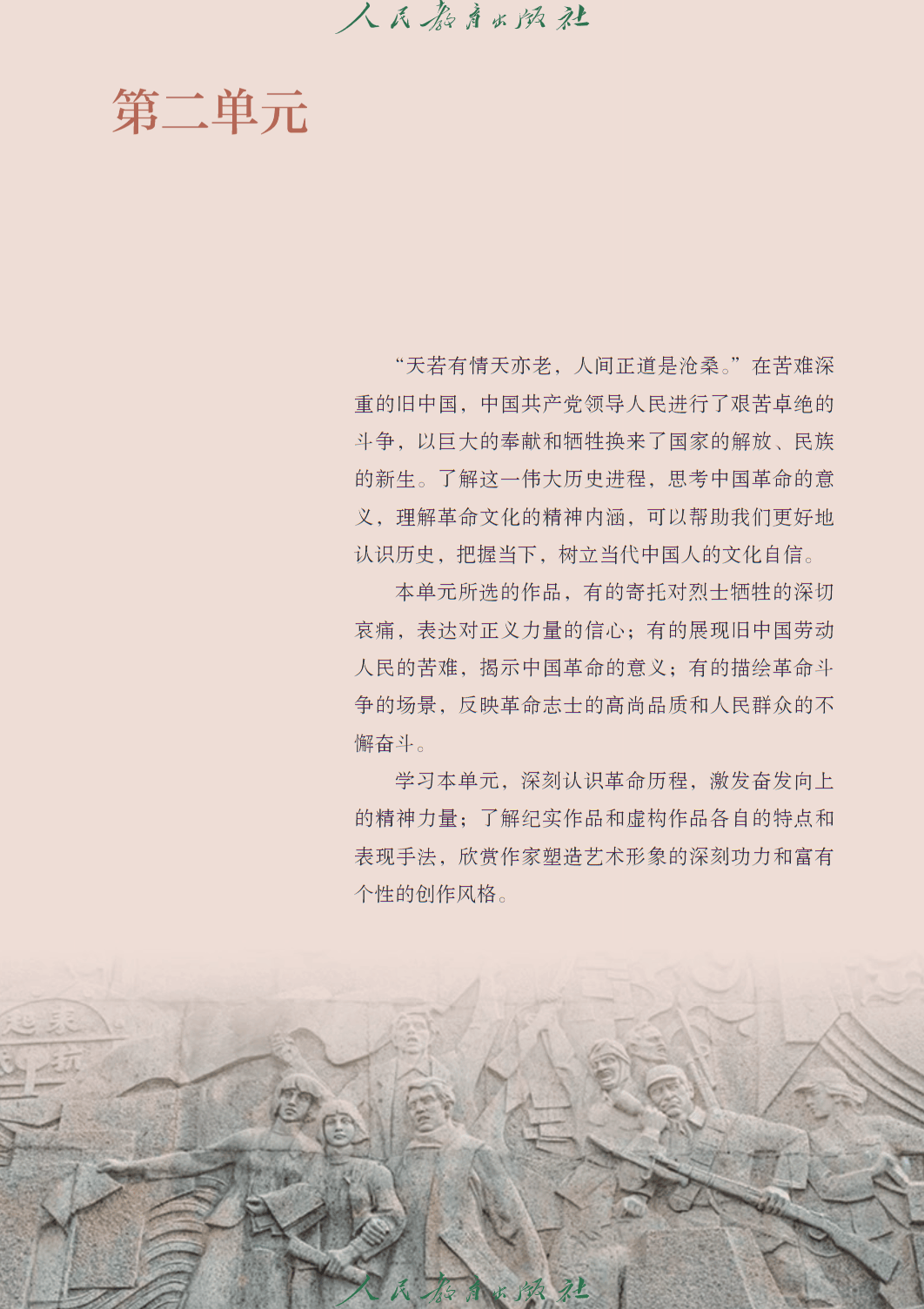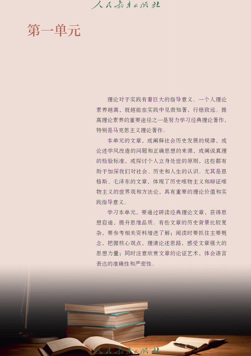 第一单元 “理论的价值” 属 “思辨性阅读与表达” 任务群,收录《实践是检验真理的唯一标准》等文本,引导学生把握理论逻辑,思考思想的现实意义。第二单元 “民族复兴的历史根基”,以《记念刘和珍君》《为了忘却的记念》等篇目,传承革命传统,强化家国情怀。