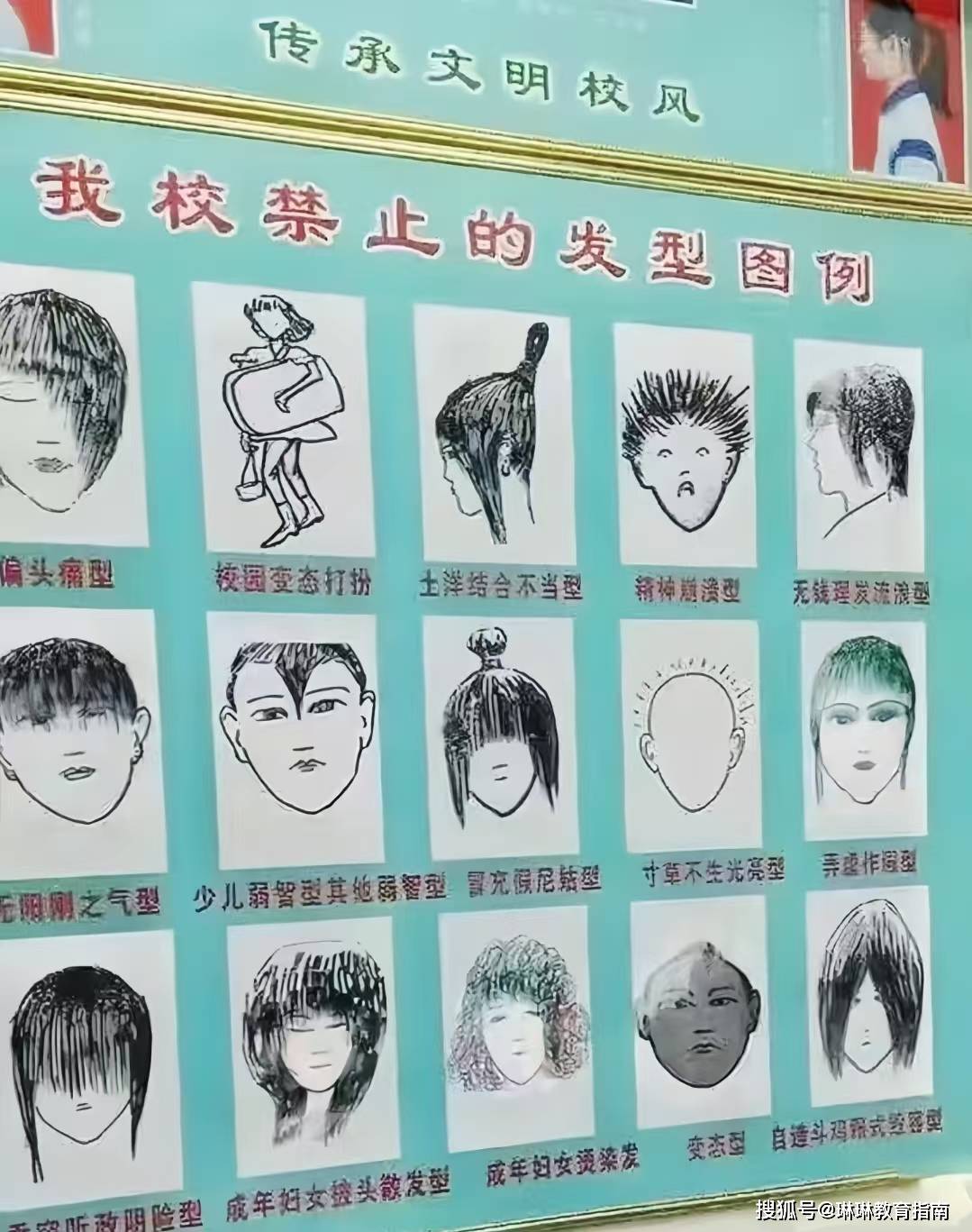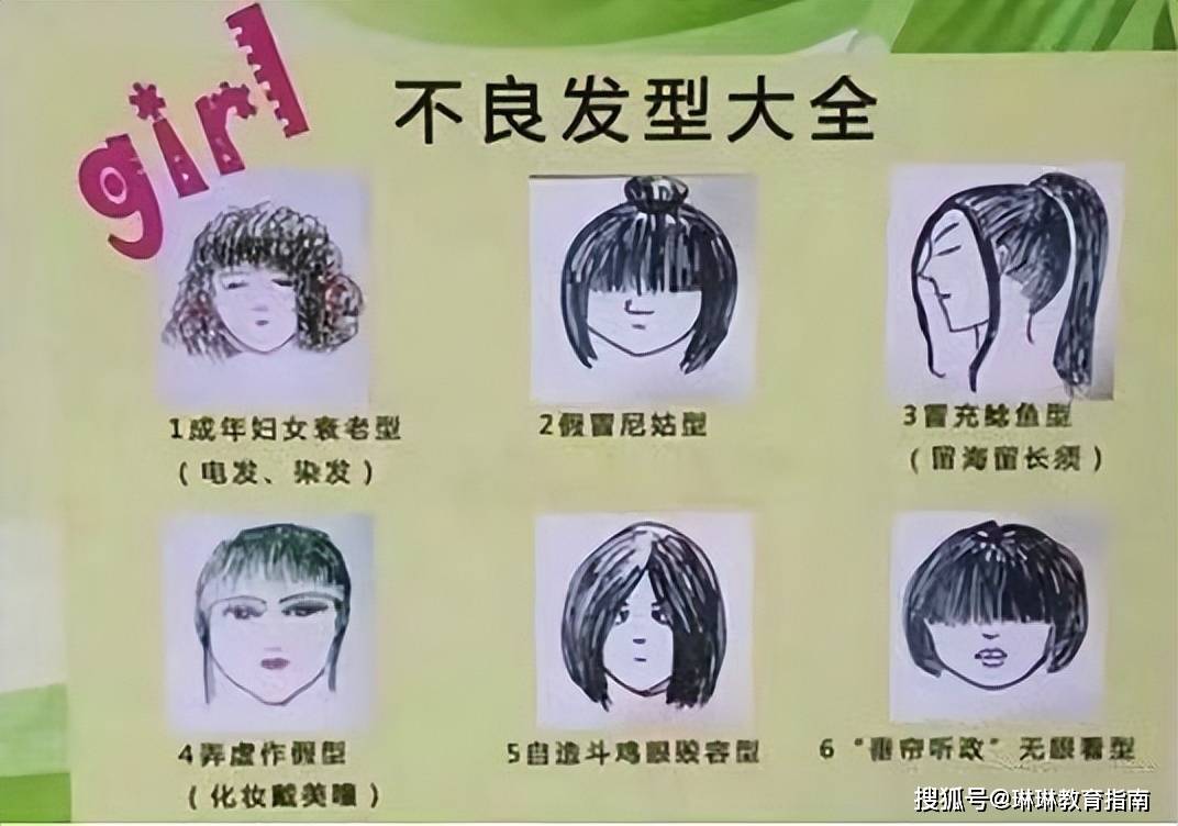 不过最过分的还在后面,有一所学校的女生开始莫名其妙地流行“垂帘听政”发型,而这个发型的流行起源就更猎奇了,是一所学校总结出的“中学生不良发型”,这些被贴在公告板上的发型,成功吸引了学生的注意。