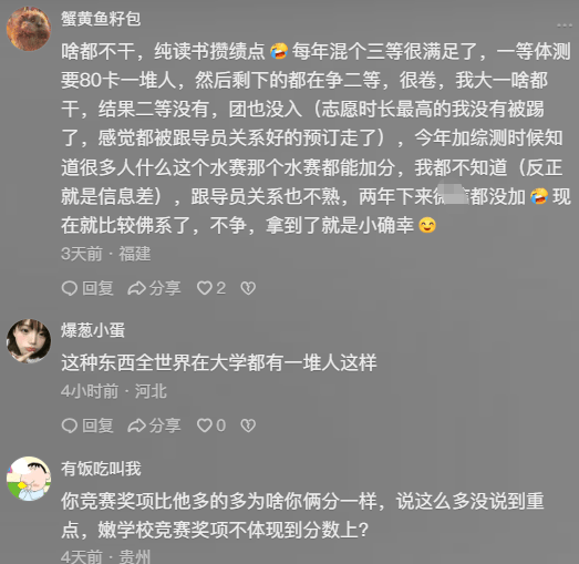其实很多大学生都有同感,想在大学拿到奖学金的话,啥都不干,纯读书攒绩点,每年混个三等就应该满足了。一等体测要80卡一堆人,然后剩下的都在争二等,很卷!我大一啥都干,结果二等没有,团也没入(志愿时长最高的我没有被踢了,感觉都被跟导员关系好的预订走了),今年加综测时候知道很多人什么这个水赛那个水赛都能加分,我都不知道(反正就是信息差),跟导员关系也不熟,两年下来联系方式都没加,现在就比较佛系了,不争,拿到了就是小幸运!