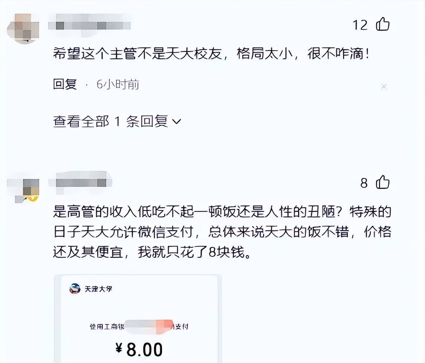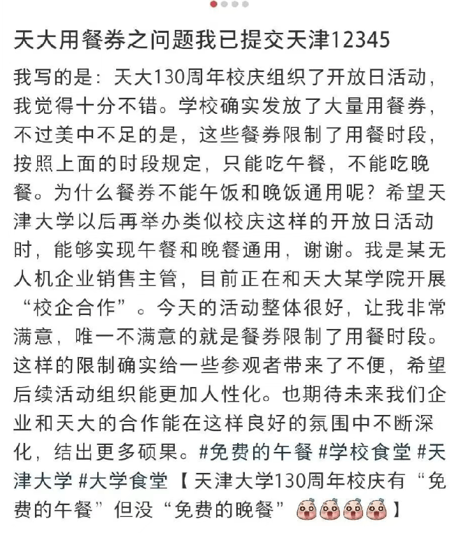 可是谁能想到里面出了点事儿,让这个校庆这个事情蒙上了一层阴影。原来一位自称是某无人机企业销售主管,目前正在和天大某学院开展“校企合作”的人发了社交媒体,说自己向12&45举报了天津大学,原来是天大给他们发放的餐券规定了用餐的时段,只能吃午餐,不能吃晚餐。