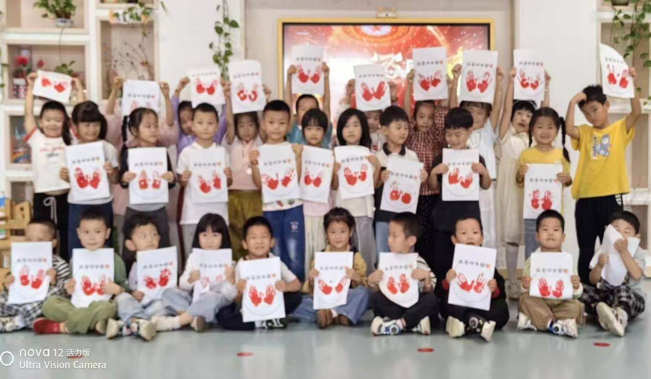 孩子们伸出小手,按下一个个手掌印,用黄色画笔点缀五角星,独特的手掌印画既藏着童真,又满含对祖国的祝福。