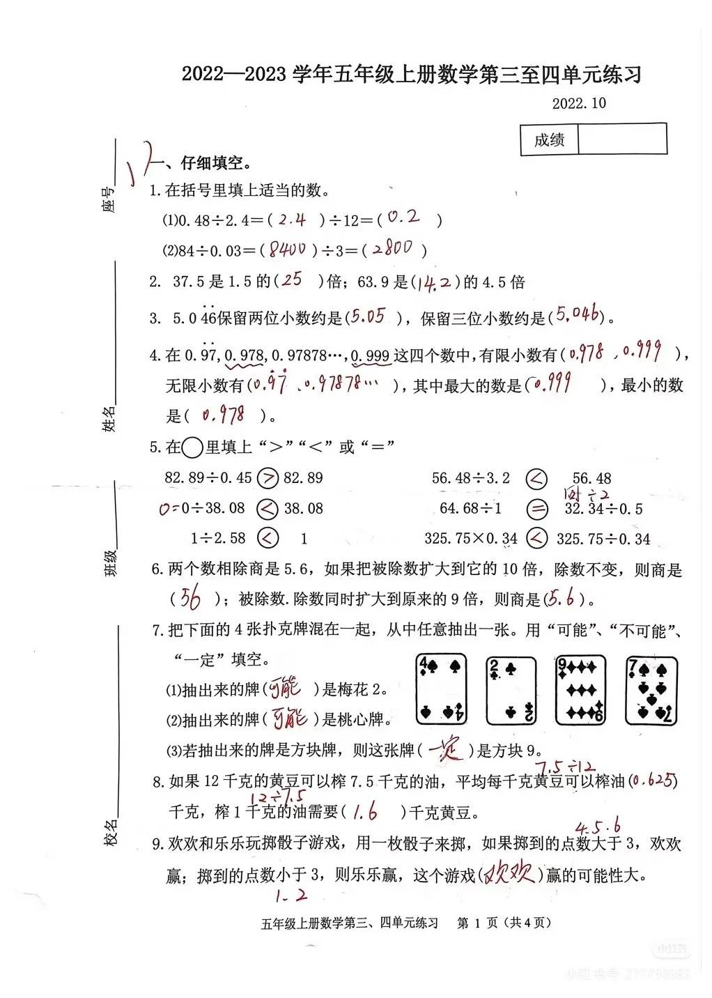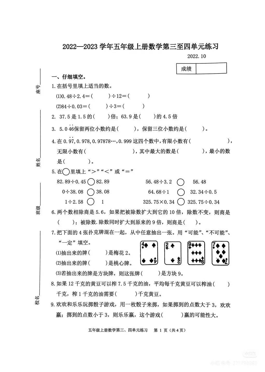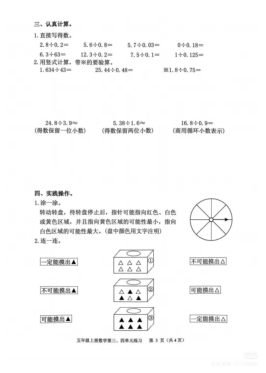 这份 2022—2023 学年五年级上册数学第三至四单元练习资料,涵盖了丰富的数学知识与多种题型。从知识内容看,包含小数除法的运算,像商的变化规律、小数除法的计算;循环小数、有限小数、无限小数的认识与区分;还有可能性的相关知识,如事件发生的可能性大小判断等。题型方面,有仔细填空,考查对概念、计算的掌握;慎重选择,检验知识的综合运用与辨析能力;认真计算,包括直接写得数、竖式计算(含验算、取近似值、商用循环小数表示);实践操作,涉及转盘涂色、摸图形的连线,锻炼动手与逻辑思维;以及解决问题,将数学知识应用于实际场景,如照片内存计算、零件加工工人数量、蛋糕制作数量、人口密度等问题。
