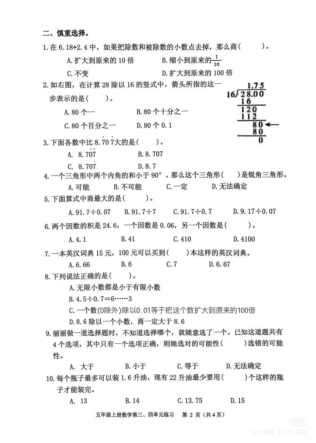 对学习有着很大的帮助意义。首先,通过多样的题型,全面考查了第三至四单元的核心知识,能让学生系统梳理所学内容,巩固小数除法的计算方法、循环小数等概念,以及对可能性的理解。其次,实践操作和解决问题的题目,有助于培养学生的动手能力、逻辑推理能力和应用意识,让学生学会用数学知识解决生活中的实际问题。无论是日常学习中对知识的查漏补缺,还是为单元测试、期末考试做准备,这份资料都能帮助学生熟悉知识考查方式,提升解题能力,夯实数学基础,进而提高数学学习的效果。