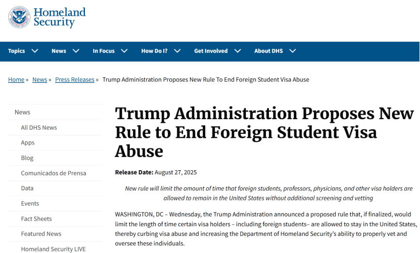 8月27日,特朗普政府公布了一项拟议新规,该规定计划缩短留学生、文化交流访问者以及媒体人员(F类、J类、I类)的签证停留时间。目前该政策仍处于提案阶段,尚未正式实施,公众有30天评议期。