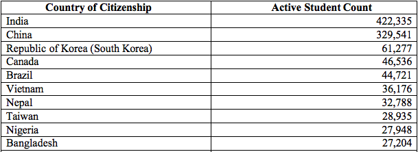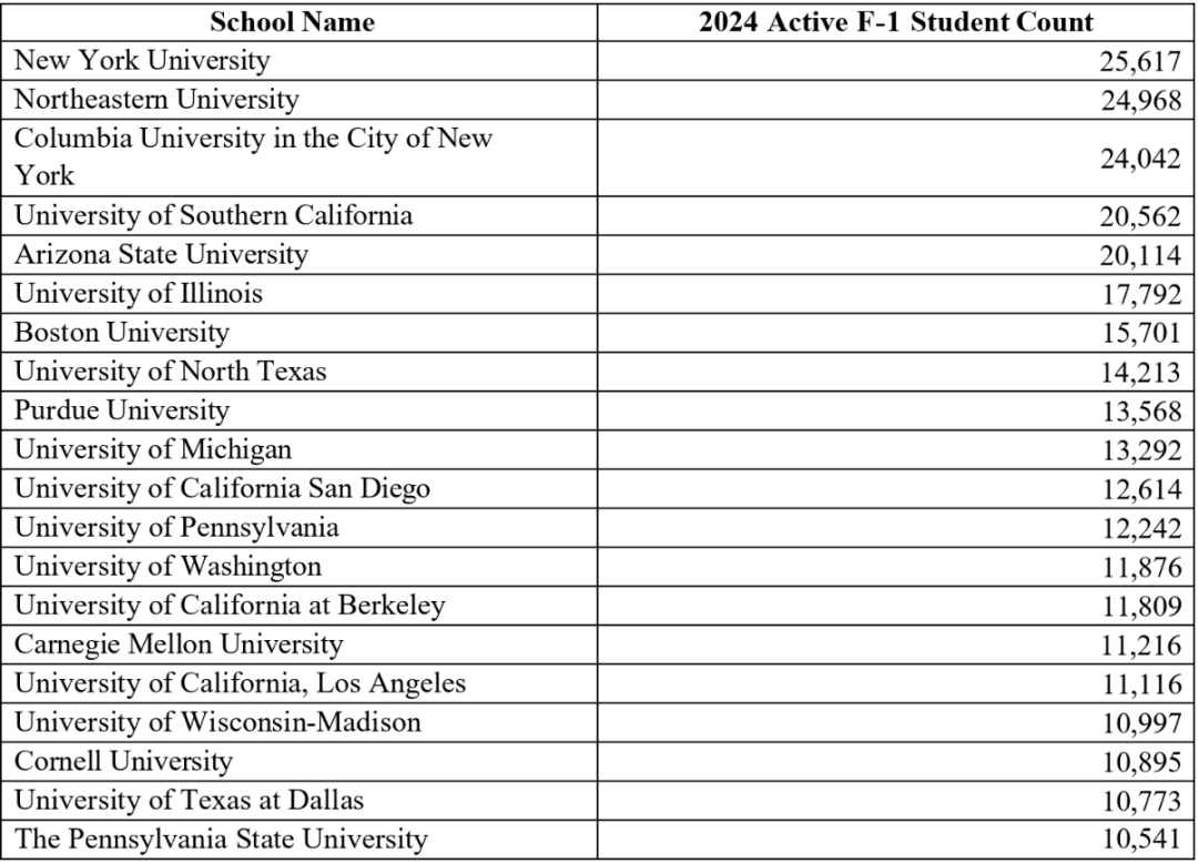 全美共有三所高等教育机构注册国际学生(F1签证)数量突破20,000: