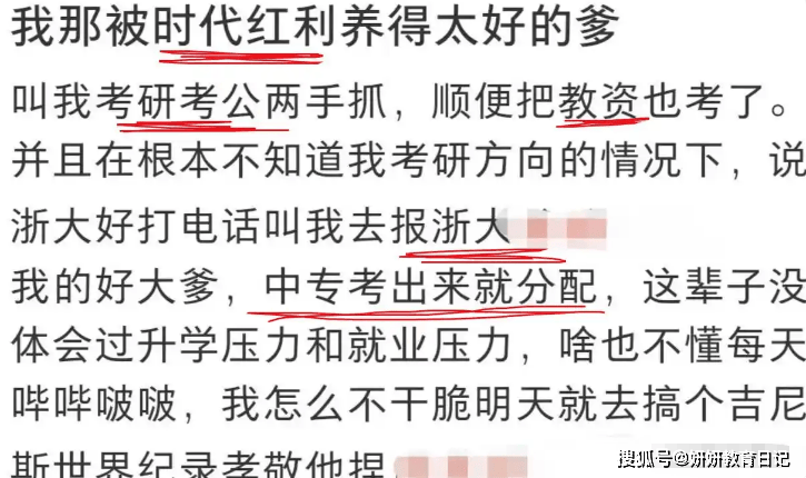 但是顺手也要把教资给考下来,而且他压根就不知道孩子准备的考研方向是什么,就直接要孩子打电话说他在网上看到了浙大这个学校很好,你以后就报考浙大吧。