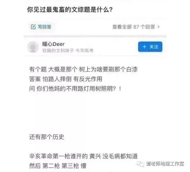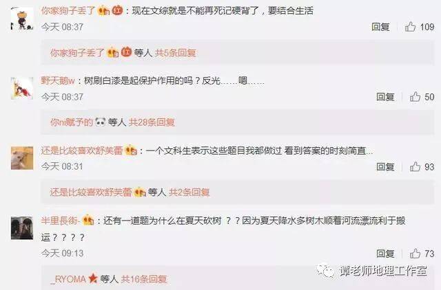 “现在文综就是不能再死记硬背了,要结合生活”“树刷白漆是起保护作用的吗?反光……嗯……”“一个文科生表示这些题目我都做过看到答案的时刻简直...”“还有一道题为什么在夏天砍树??因为夏天降水多树木顺着河流漂流利于搬运????”“为什么二战德国三天就占领了法国?因为法国下雨延缓了德国的行军速度”