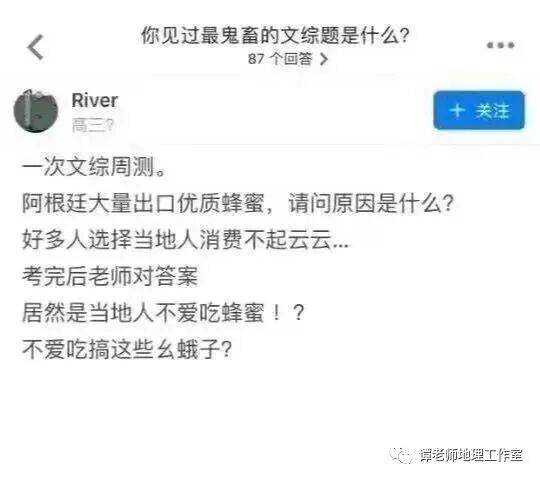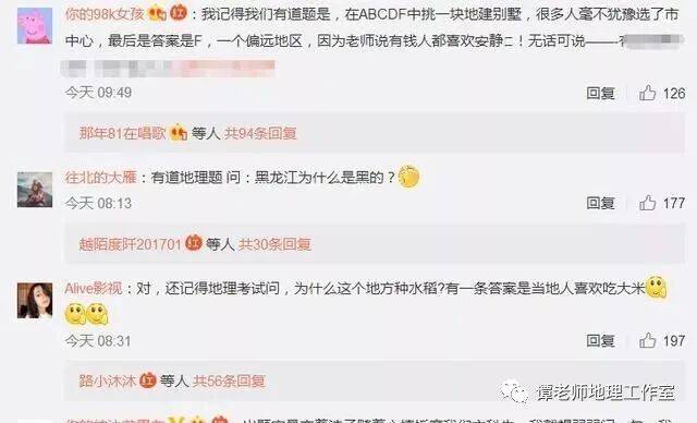“我记得我们有道题是,在ABCDF中挑一块地建别墅,很多人毫不犹豫选了市中心,最后是答案是F,一个偏远地区,因为老师说有钱人都喜欢安静”“有道地理题问:黑龙江为什么是黑的?”“对,还记得地理考试问,为什么这个地方种水稻?有一条答案是当地人喜欢吃大米”“出题官是变着法子随着心情折磨我们文科生,我就想弱弱问一句,我们文科生吃你家大米了吗?”